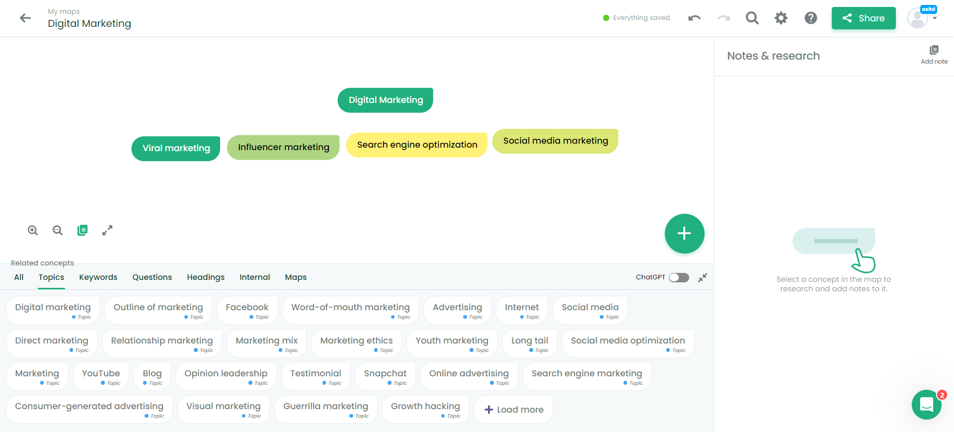 For instance, under 'SEO,' you might have sub-branches like 'Keyword Difficulty' or 'SERP' This level of detail is crucial for thorough content planning and helps uncover highly specific and targeted content ideas.